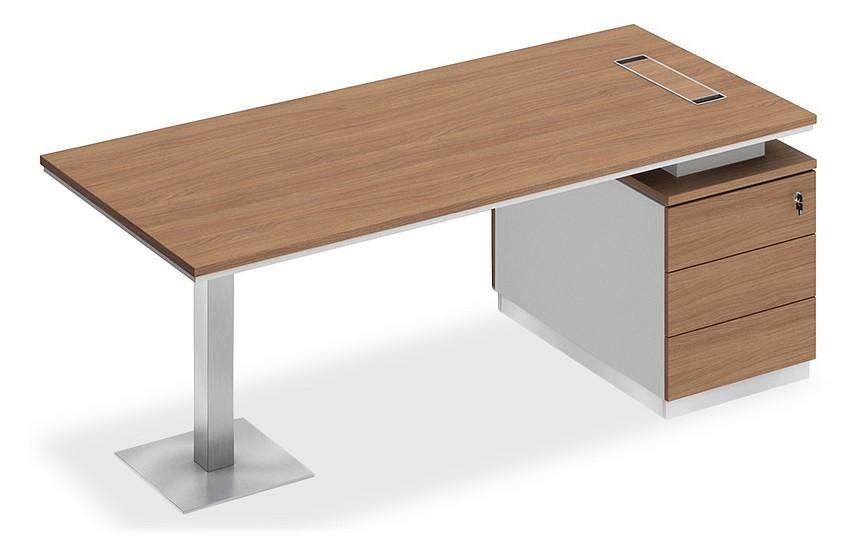 Стол состоит из столешницы, заглушки кабель-канала, металлической опоры и опорной тумбы.