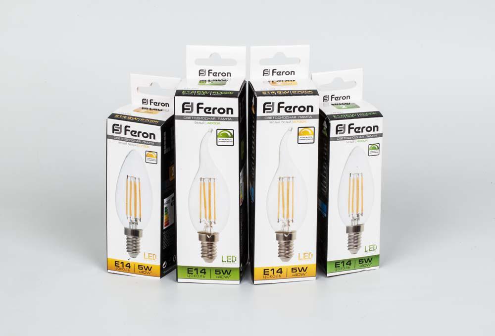 Лампа светодиодная филамент FERON LB-68, C35 (свеча) диммируемая, 5W 230V E14 2700К (белый теплый), рассеиватель прозрачный 530Lm, угол рассеивания 270°, корпус стекло, 100*35мм