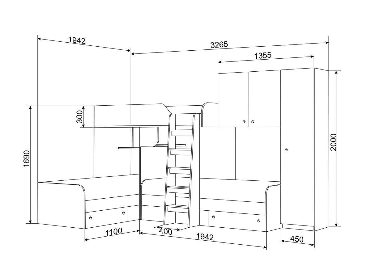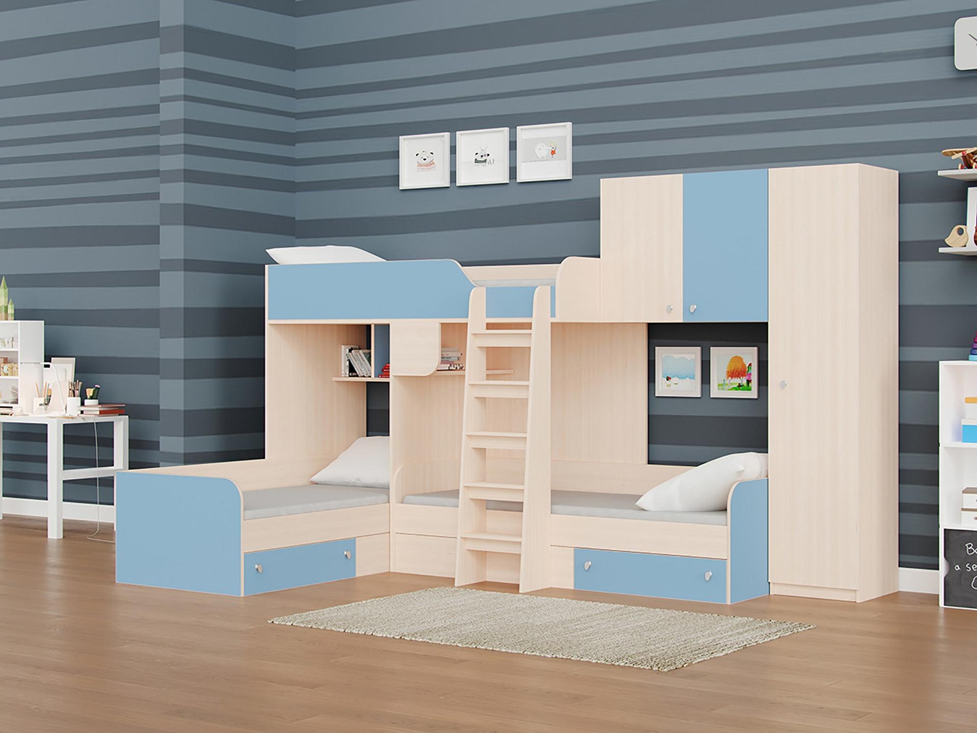 Ваш ребенок вырос и пришла пора обновить мебель в детской комнате? Набор для детской Трио/2 RVM_TRIO-V2-1-6 – отличное решение, которое придется по вкусу не только вам, но и будущему маленькому хозяину или хозяйке. Изделие выпущено известным брендом РВ-Мебель (Россия) и относится к серии «Трио/2». Благородный матовый корпус оттенка голубой, дуб молочный смотрится изысканно и изящно, гармонично дополняя фасад, изготовленный из практичного и востребованного для детской материала (ЛДСП Е1). Перед покупкой новой кровати советуем тщательно замерить свободную площадь в комнате, чтобы кровать точно подошла по габаритам (2000 мм в высоту, 3265 мм в ширину и (уточните актуальную информацию у нашего консультанта) мм в длину), а также подобрать 3 матраса 1900x800. В комплект входит лестница;
