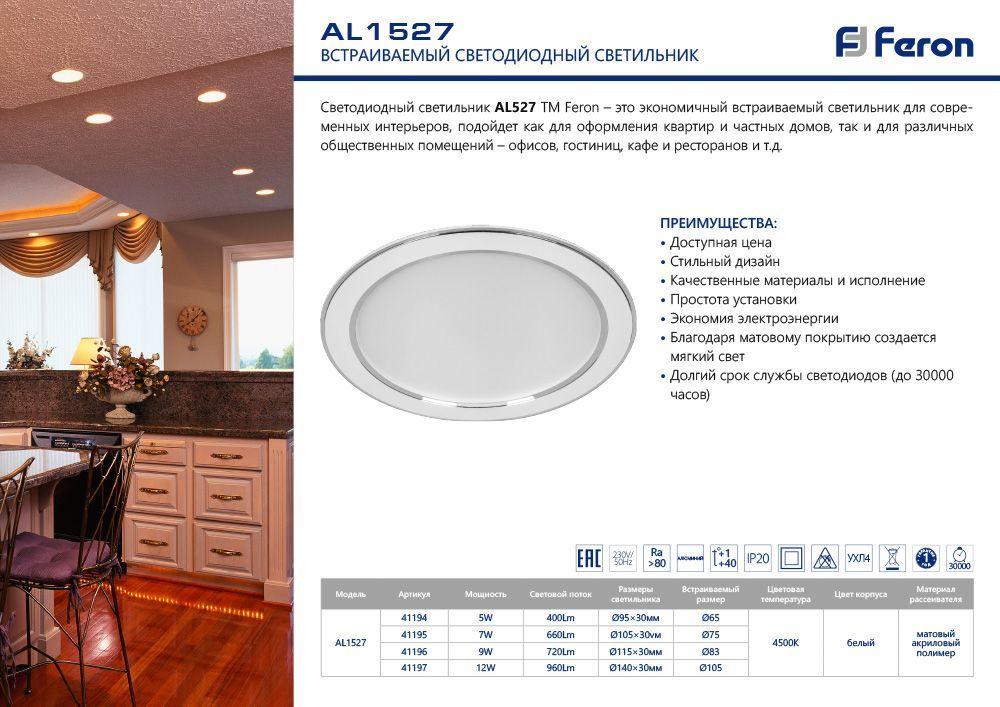 Встраиваемый светодиодный светильник Feron AL1527 41194